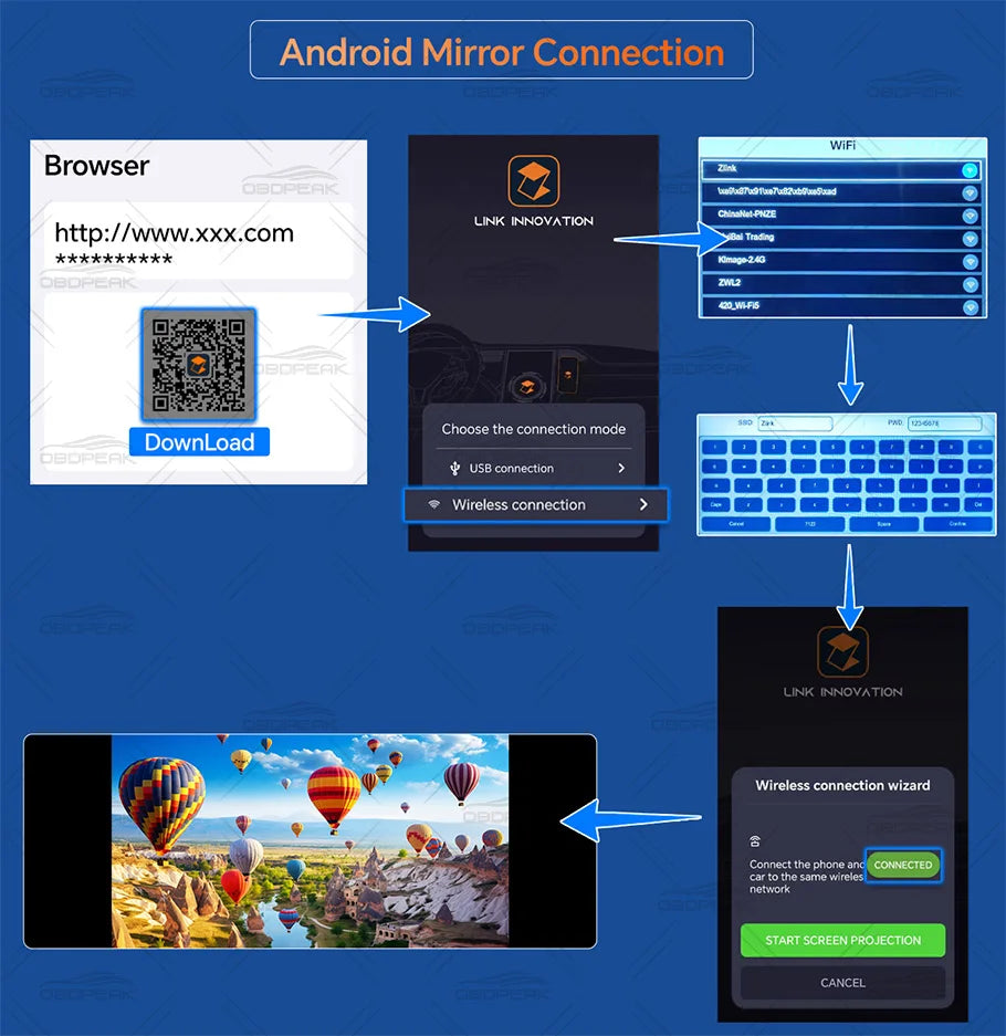 答:选择安卓镜像设备,扫描二维码下载专用软件,然后连接设备WIFI,在软件中选择设备屏幕镜像选项。