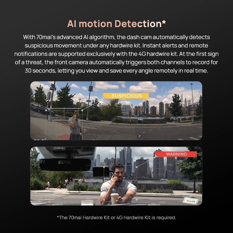 借助先进的 AI 运动检测算法,A810S 能够识别停放汽车周围的可疑人类活动,并自动激活录制。