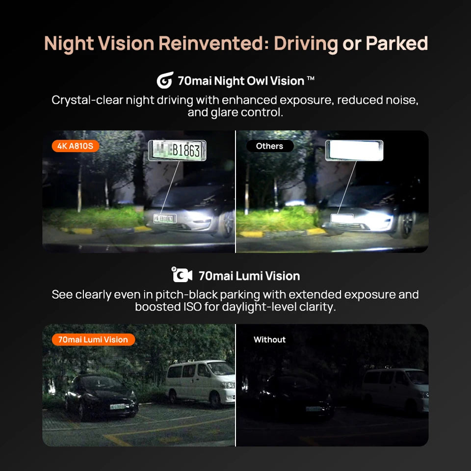 70mai Lumi Vision - 即使在漆黑的停车场也能清晰看到,延长曝光时间并提高 ISO,达到白天般的清晰度。