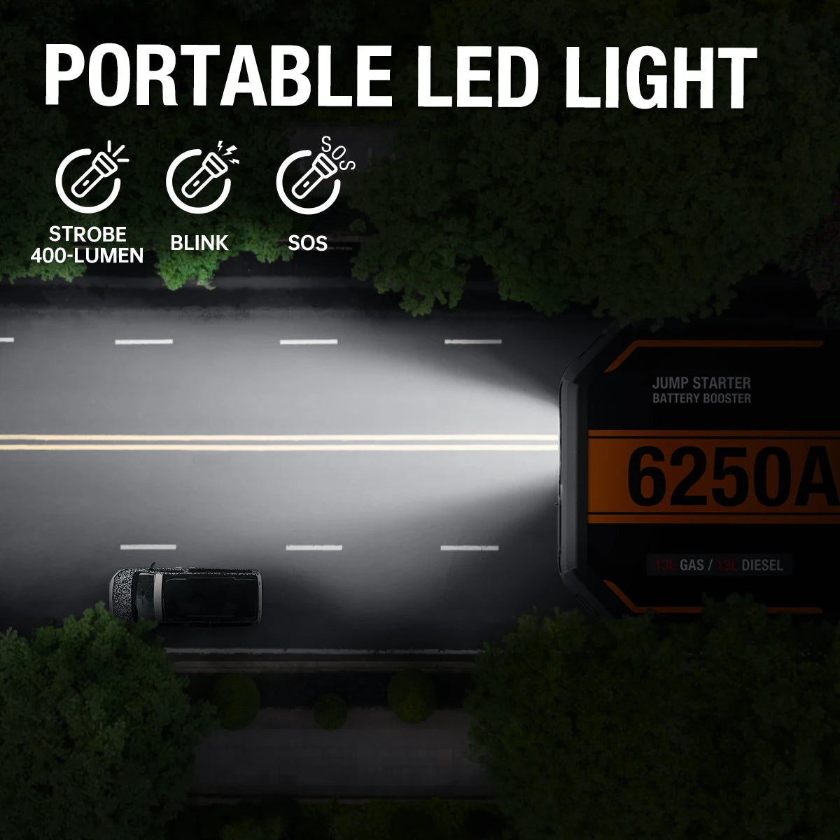 6250A 便携式 12V 汽车应急启动电源,带电瓶增压功能,适用于排量高达 10.0L 的汽油发动机和 6.5L 的柴油发动机